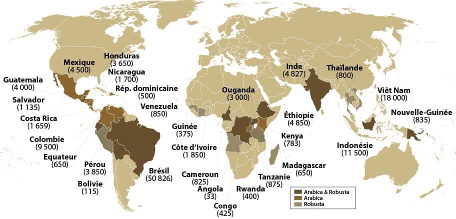 Cartographie de la production mondiale de culture du café en fonction des différentes variétés.