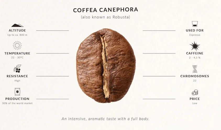 À commencer par le Robusta, il tient son nom du mot latin « robustus » qui signifie robuste ! En effet, cette plante cultivée(coffea canephora) est plutôt coriace et n’est pas très sensible aux maladies ou aux changements climatiques. Un phénomène qui s’explique en partie par sa forte teneur en caféine.